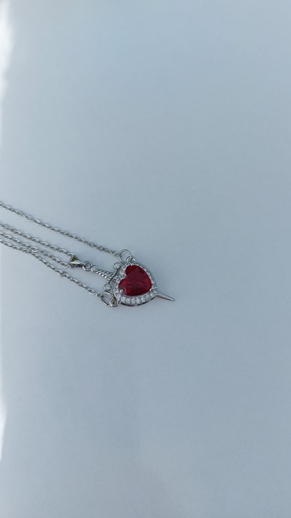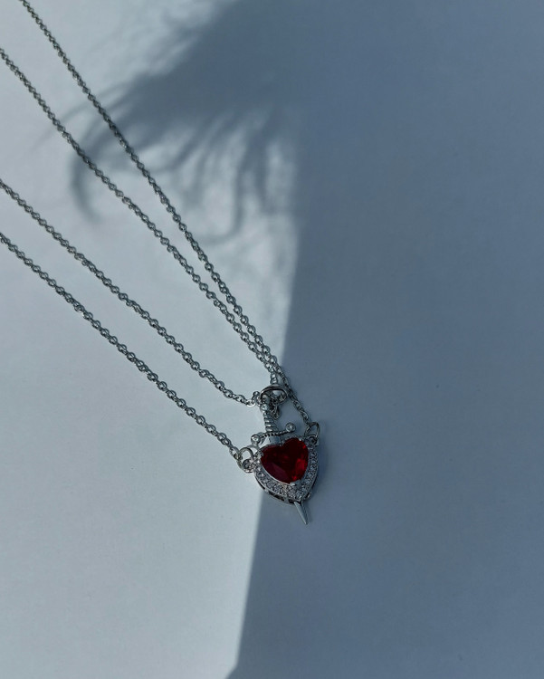 این ست شیک شامل دو گردنبند با طراحی نمادین است: یکی قلب عاشقانه و دیگری شمشیر قدرتمند، ترکیبی از عشق و شجاعت را به نمایش میگذارد.